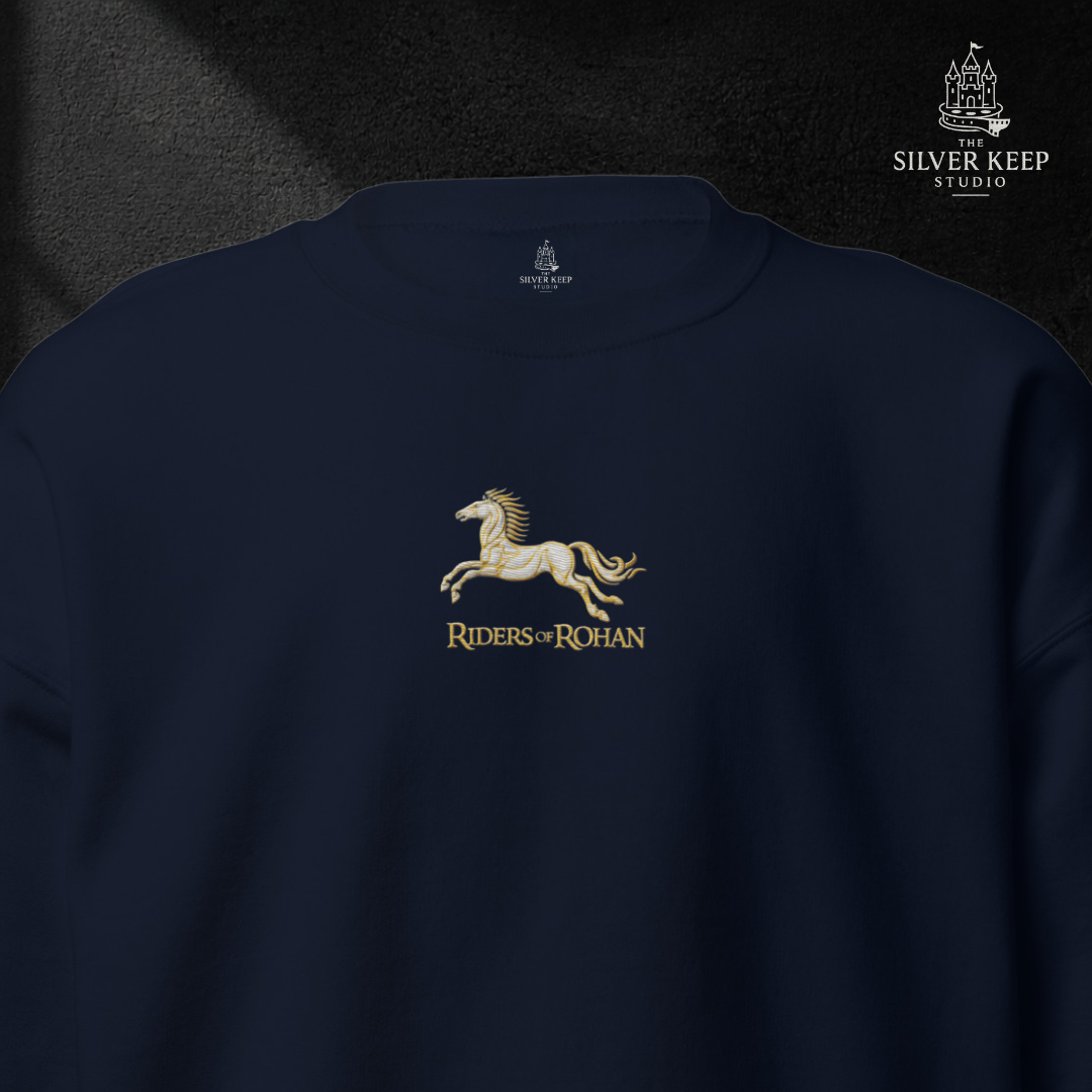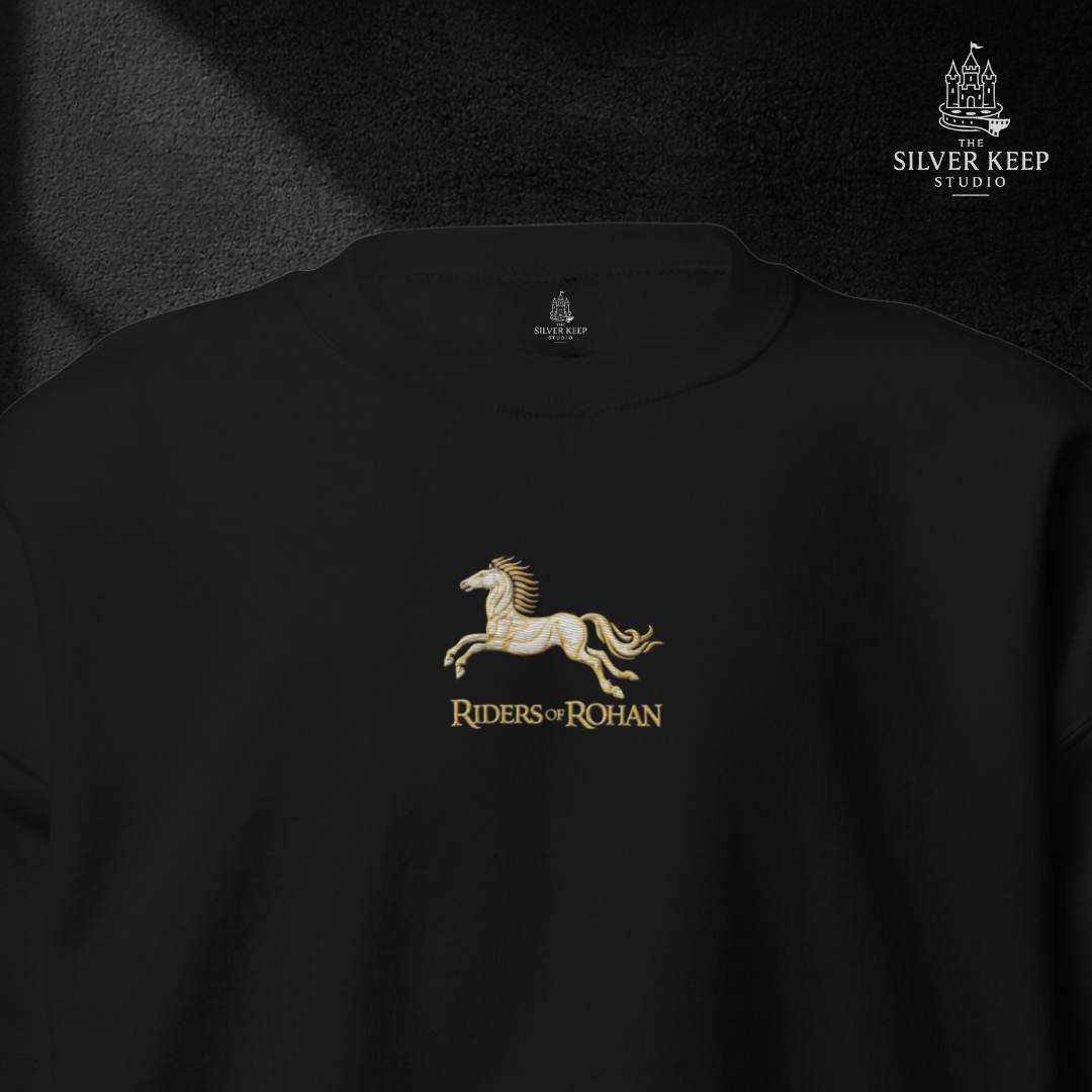 Un diseño limpio, heráldico y poderoso que representa el espíritu indomable de Rohan: honor, lealtad y valentía hasta el final.